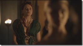 Lucretia's (Lucy Lawless) Green Gown worn in the 2010 Spartacus TV series; Blood and Sand. The scheming wife of Batiatus (John Hannah) wears this in the ninth episode “Whore” in which she plots to bring Licinia and Spartacus 'together', instead switching the legendary Gladiator with Crixus (Manu Bennett).