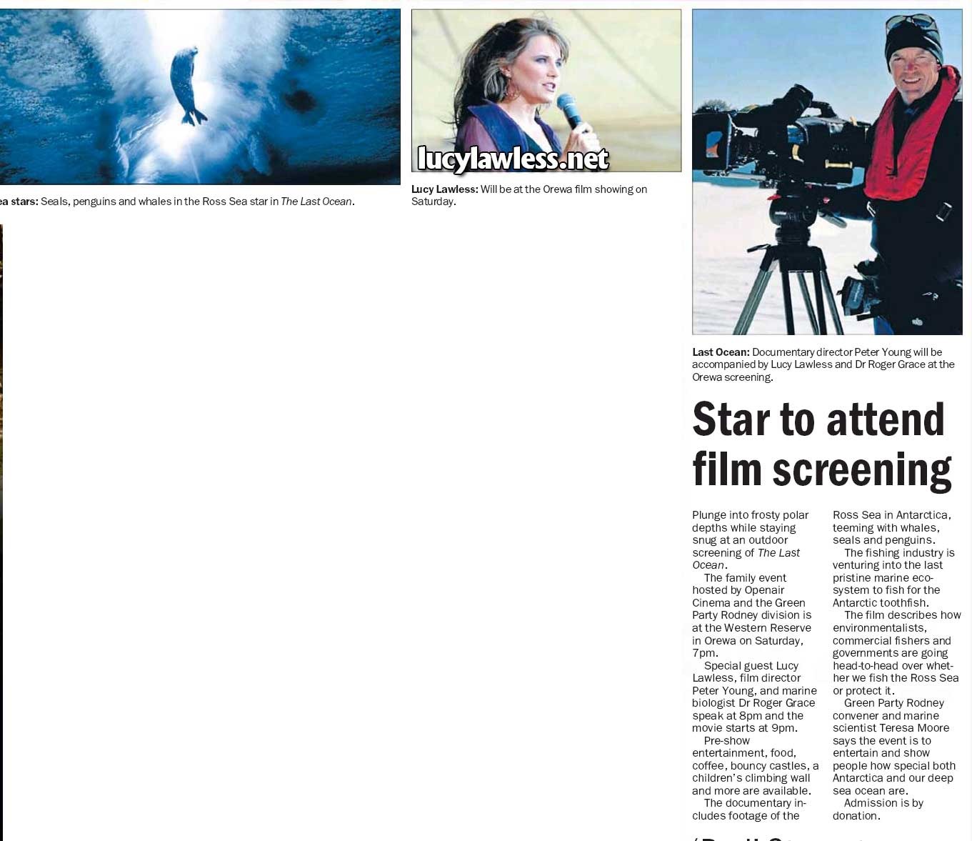 The following article appeared in The Rodney Times (New Zealand) 16 January 2014. Last Ocean: Documentary director Peter Young will be accompanied by Lucy Lawless and Dr Roger Grace at the Orewa screening on Saturday 18 January 2014.
